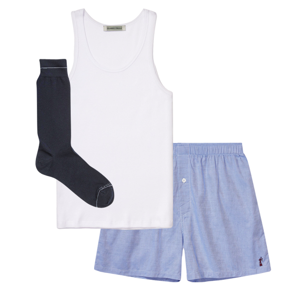 Classic Fella’s underwear, sock, and shirt assortments easily pair as sets in matching and mixed colors with their most classic being a full white set.