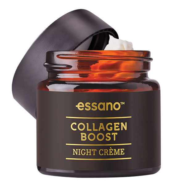 Essano Collagen Boost Night Crème contains plant peptides to stimulate Collagen production and skin repair while you sleep. Certified organic Rosehip Oil provides intense moisture for more youthful, resilient skin.