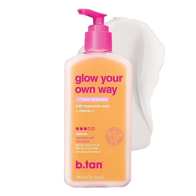 Glow on the go! Glow Your Own Way is an express tan lotion with hyaluronic acid and vitamin C that develops as quickly as one hour.