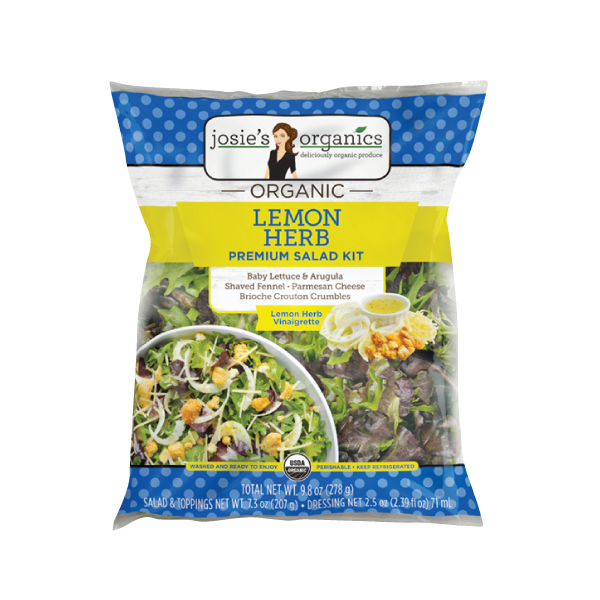 Josie’s Organics Lemon Herb is a delicious blend of organic baby lettuce, arugula, shaved fennel, parmesan cheese and an added crunch of brioche crouton crumbles.