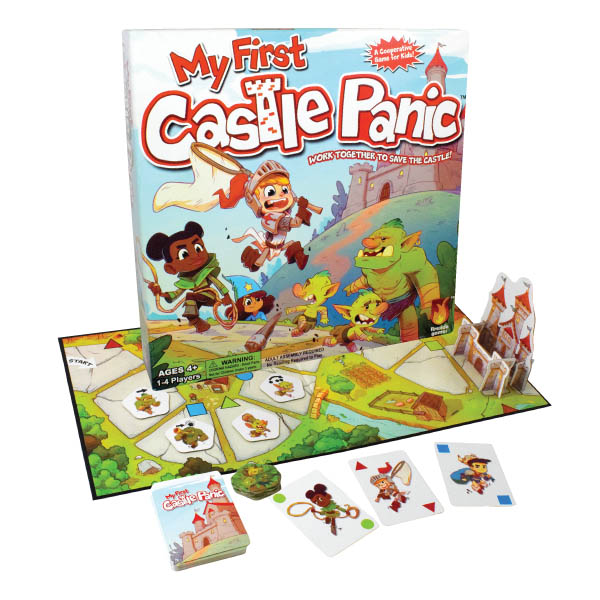 My First Castle Panic is a preschool version of the classic family game Castle Panic. Players must work together to defend the castle from waves of monsters. Play cards to match the color and shape of the space a monster is on to capture that monster.
