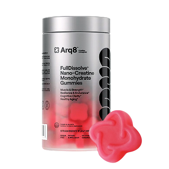 Arq8 Nano-Creatine Monohydrate Gummies: 5g clinical dose, sugar-free, natural strawberry flavor.