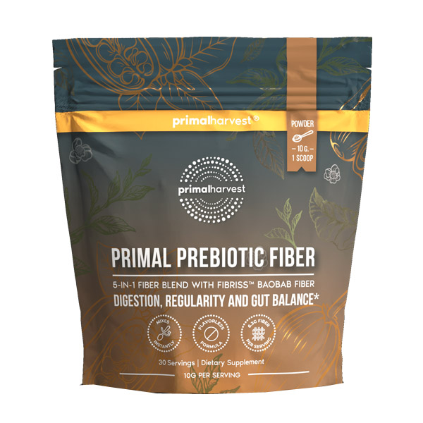Primal Harvest’s Prebiotic Fiber is an instant-mixing fiber-superfood blend formulated with organic acacia gum, green banana, and apple fiber that supports healthy digestion, appetite control, and regularity.