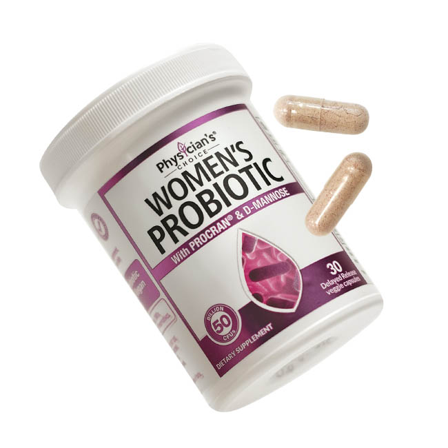 Physician’s Choice Women’s Probiotic uses science-backed ProCran and D-Mannose for feminine and UT health, along with 50 billion CFUs for digestive balance and immune system support.